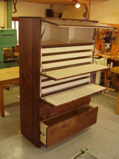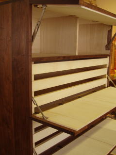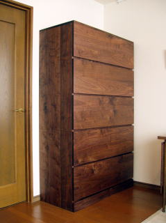 いえ、これは立派な箪笥ですね。大切な着物を湿気や害虫から守るため、総桐にしたいが外観はウォールナットで!とのご要望です。そこで、内側に面する部分は全て桐材を貼りました(和洋折衷でしょうか)。