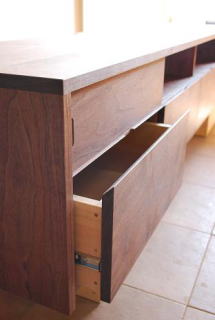 ウォールナットの抽斗は上端を45度にカットし、小さな手掛けを設けています。
