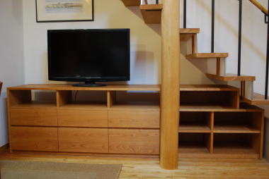 先に納めたダイニングテーブルと高さを合わせ、階段下をフルに活用した収まりの良いハコに仕立てています。