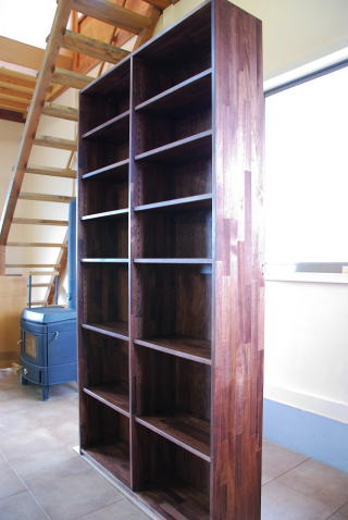 書斎の蔵書を全て収める本棚を、ということでご相談を頂きました。かなりのボリュームとなるので、早々に無垢材は諦め、パイン集成材を使用。問題は先にお納めしたウォールナットのデスクとどう折り合いを付けるか?