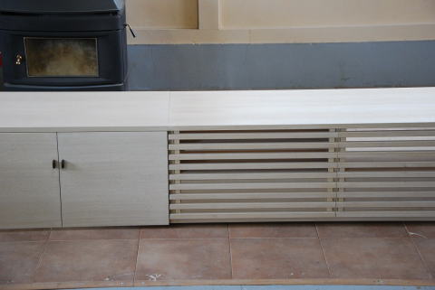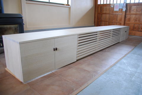 AVボードはほぼ2間幅の大きさ。中央の格子部にはAV機器を、両脇は一般収納となります。真ん中の列にはシアタールーム用にとセンタースピーカーを納める為、必然的に格子のデザインとしました。