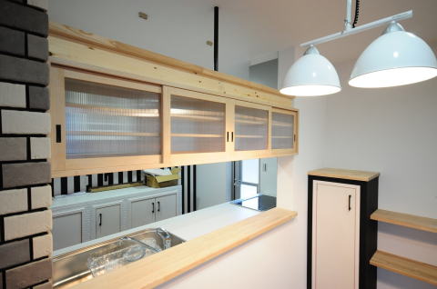 食器棚はキッチンカウンター上の梁に吊り下げる方式。片側4枚の引き戸にはポリカーボネートシートを使い、非常に軽く、中が直接見えない様にしています。