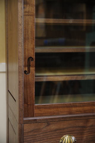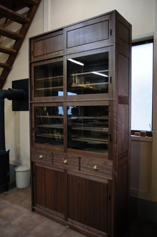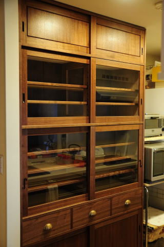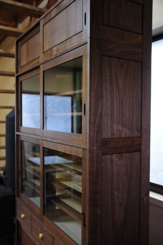 趣味でチェロを弾くオーナーの希望で、真ん中の扉には楽器のF字孔を模した引き手を彫り込みました。オーダーメイドならではの造りです。