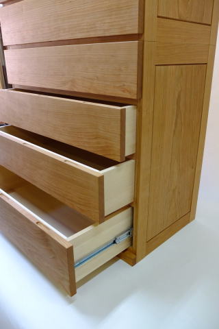 抽斗はご覧の通りスライドレールと仕込み抽斗が混在。内部の寸法確保と使用頻度を考えての事です。