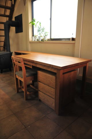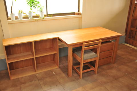 チェリー材のデスク・シェルフ・チェスト。ウォールナット材のダイニングチェアー。