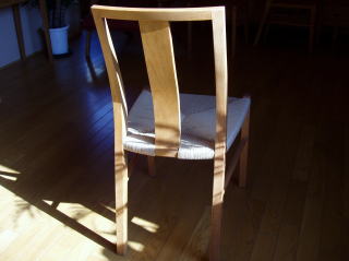 4脚の椅子の内、2脚は板を彫り込んだ座面。もう2脚は”ペーパーコード”を編み込んだ座面とし、2種類の座り心地が楽しめます。板の方は男性的、ペーパーコードは女性的な雰囲気が有り、座り心地も同様に特徴が有ります。