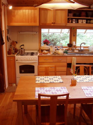 木材がふんだんに使われたダイニングに、艶を抑えたブラックチェリーのテーブルが良く似合います。