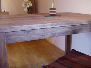 テーブルの足に近いところに引き出しを付けると強度が落ちますので、幕板の長さを確保したセンターに設置。A3ファイルが入る大きさです。また、引き出しを閉じたときに、幕板と面一になりここに引き出しが有るとは判らない様に仕込んでいます。