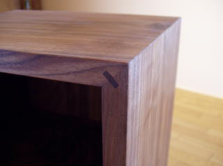 板組家具の継ぎ手はいろいろ有りますが、今回留め切り+雇いざねを使ってみました。外観に継ぎ手部分が見えない為、すっきりした印象ですが、雇いざねが有ることで強度的な安心感と手仕事の証を見ることが出来ます。