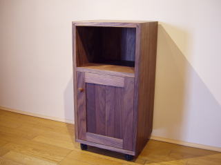 シャープでスクエアーな箱にブラックウォールナットの不規則な木目が面白い表情を加えています。扉の鏡板は短冊状の薄板を並べて、少し和の雰囲気も狙っています。