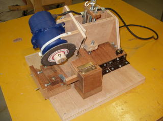 この研磨機を作るのに新たに購入した部品は砥石とスプリングぐらいで費用は2000円程度。新品のブレードを買えば3000円程度しますので、1回再研すれば直接費は元が取れます。それよりも切れ味が改善する事に大きなメリットが有ると考えます。複雑な加工は一切有りませんので、木工を経験している方ならどなたでも作ることが出来ます。構造的にはテーブル上で作業する形式としましたが、オンマシンで研磨する機構も可能です。