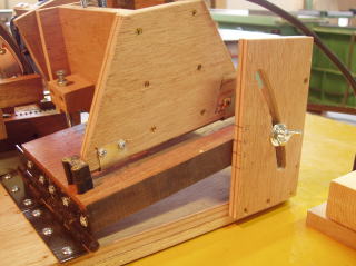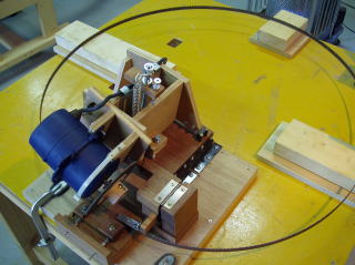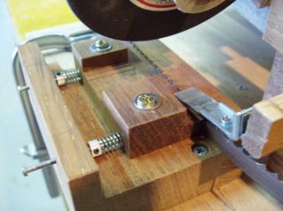 研磨するブレードを保持するためのホルダーです。摩耗しにくい様に堅木を使い、スプリングで挟み込む構造です。ホルダーはモーター軸に対し平行でなければなりませんが、少し調整出来る様にしています。ここを調整することによりバンドソー特有のドリフトをキャンセル出来ないかとのねらいがあります。