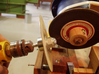 まず、モーターはいらなくなった換気扇用のものをそのまま使っています。回転数は不明ですがだいたい2000rpm程度でしょうか。それに薄刃の砥石(外周の片方が面取りしてあるもの)を取り付けます。フランジは木で出来ており、モーターに取り付けた状態で削りだしてやる事で芯を出しています。