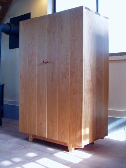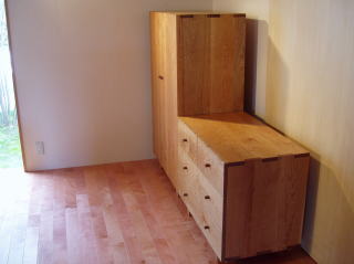 装飾の多い市販の家具に比べてなんともあっさりとしたスタイルですが、この潔さが逆に新鮮に映ると思います。ワードローブの扉は通常框組が多いのですが、チェストとの統一を考慮し一枚板に見えるようにしています。扉の構造はフラッシュに近いですが、無垢材の収縮に対応出来るようになっています。