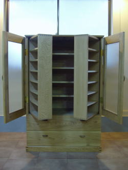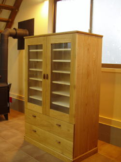 お座敷に置く予定でしたので、材質・デザイン共、和を意識しています。私なりの解釈ですが、台輪と甲板を張り出させる事でどことなくお仏壇を連想させます。また、扉のガラスには半透明スリガラスを使い、中の見え方を調整しています。
