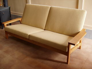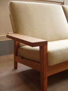 チェリー材を使ったソファー。昨年同じ材種でテーブルとチェアーを作らせていただいたお客様からのリピートオーダー品です。市販のソファーをいろいろ探し回ったそうですが、どうしても気に入ったものが無く、当工房にご相談に来られました。