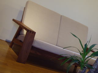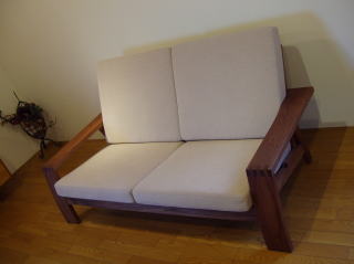 前回製作した3Pソファーと同様、座面を深く傾斜させたリラックス性の高い作りになっています。背もたれも極力高くし、頭が乗せられる様にしましたが、このへんは好みの分かれるところでしょう。シートはあくまでも堅く、お尻が痛くならないよう考慮されています。