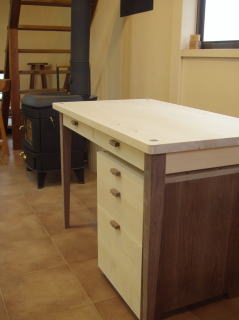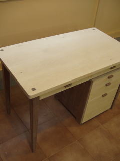 デスク・チェスト共に2つの材料でコンビとし、統一感を出しています。天板4隅に見えるのはアクセントの埋木です、ホゾが貫通している訳では有りません。