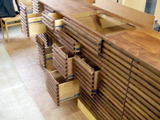 右半分が扉、左側は細かく仕切られた抽斗がずらりと並び、まるでパズルの様です。天板中央付近のガラスは家族全員の携帯電話を納める場所で、2列繋がった抽斗の中が見えるように工夫されています(勿論充電器用コンセント付き)。
